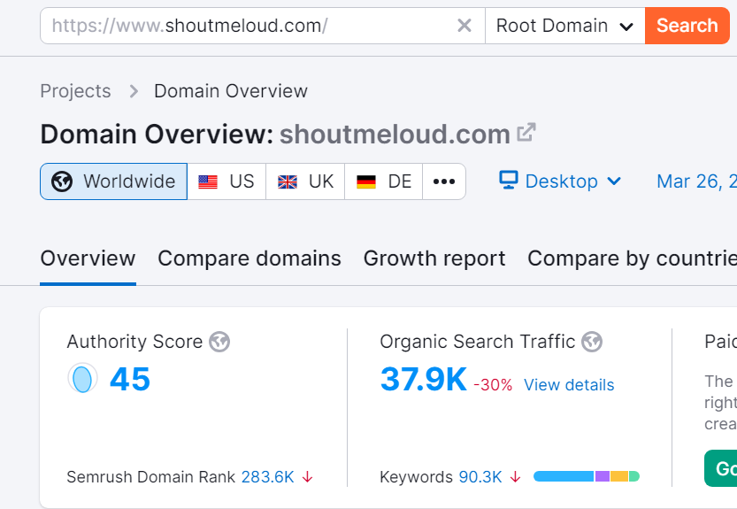 To cite another example, I found the domain authority of another website called ShoutMeLoud. As you can clearly see ShoutMeLoud has a domain authority of ’45.’