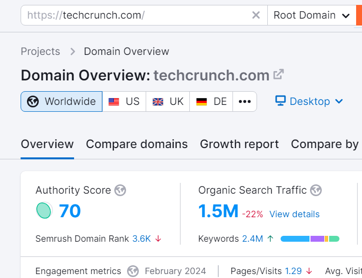 Here I’ve shared the screenshot of a popular tech website Techcrunch’s domain authority. I used SEMrush’s domain overview feature. As you can clearly see in the screenshot that Techcrunch has a domain authority of 70 and boosts monthly search traffic of 1.5 Mn.