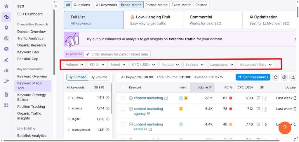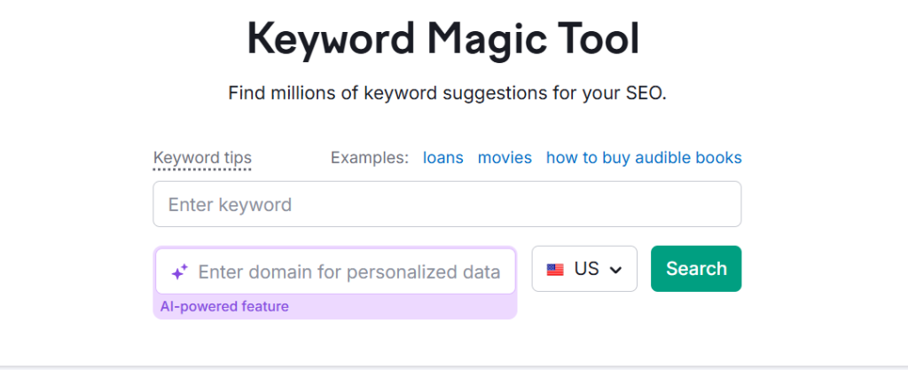 keyword magic tool is one of the top offerings and features of SEMrush. Whenever you want to conduct keyword research on SEMrush, you always need to head to keyword magic tool.