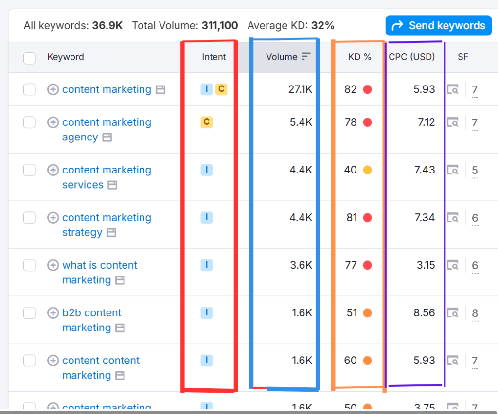 The first box marked in red color is showing search intent. The second box marked in blue color is showing search volume, third box in orange color is showing keyword difficulty score (KD%) and the fourth box showed in purple color is showing CPC.