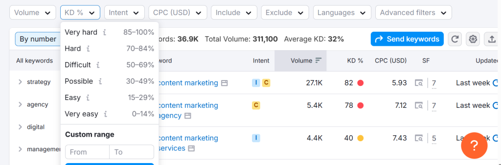 As you click on the KD% filter, you will see many options like very hard, hard, difficult and possible among other options. In this case, we’ve chosen the option ‘possible.’