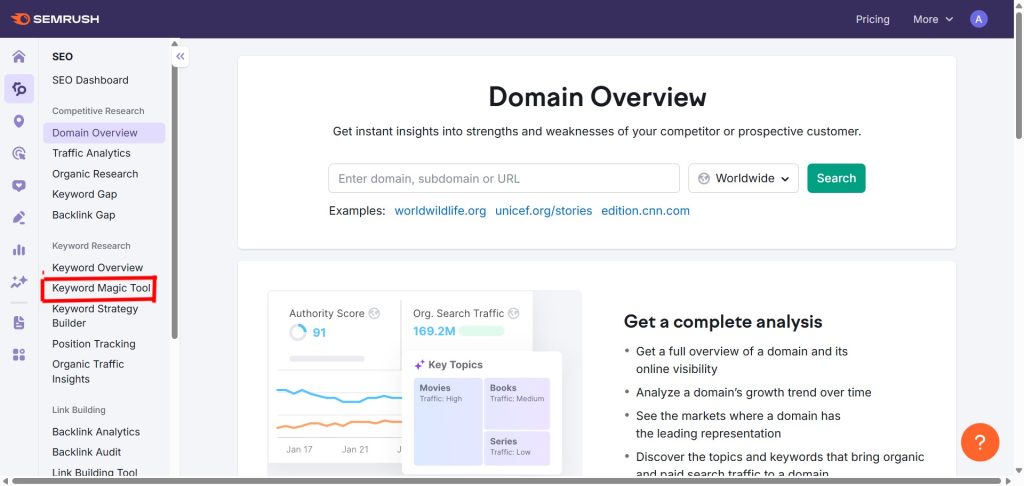 Kindly go to SEMrush’s domain overview feature for checking any website’s domain authority.