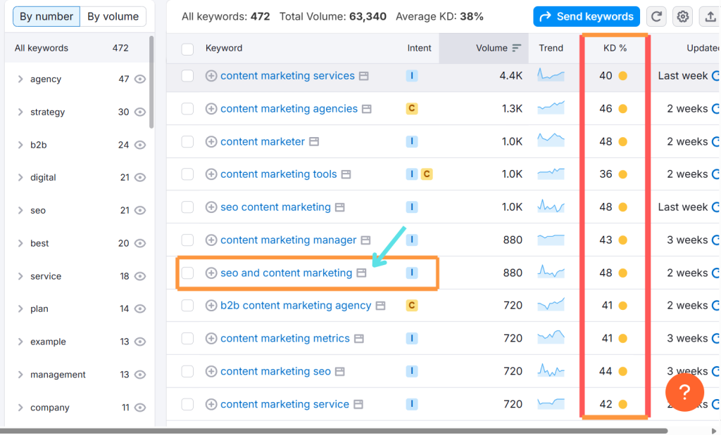 Keyword difficulty score: Keyword difficulty score, usually denoted as KD%, is one of the important metrics. It shows a rough estimate about how difficult it would be to rank a specific keyword on the first page of the search result.